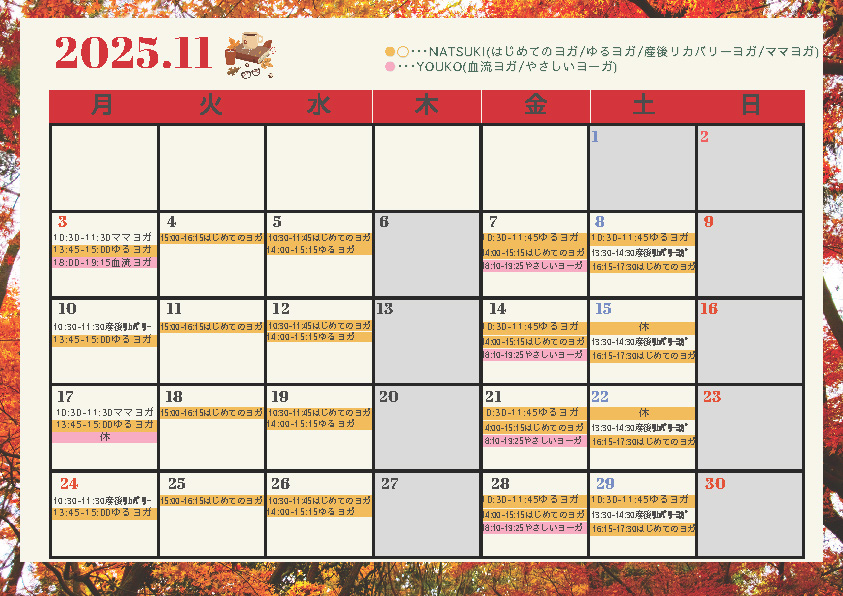 | 2025/11/1 | 【ヨガ】 | 「2025年11月スケジュール」をアップしました。 |
